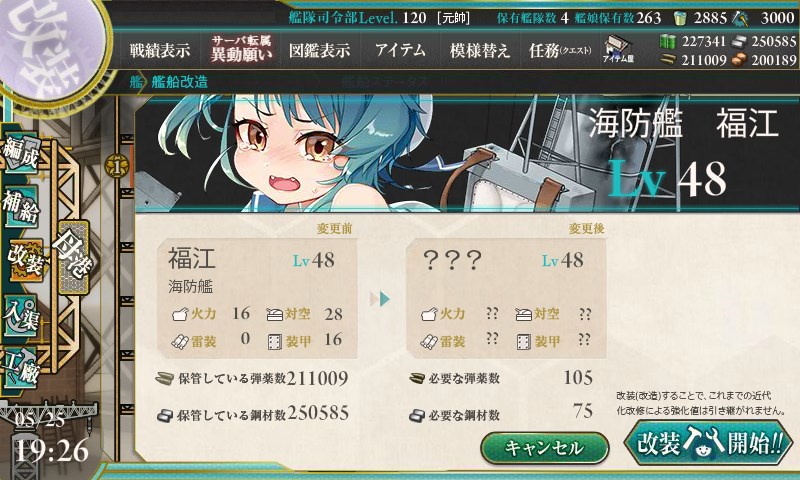 1-5で梅干掘り中に改装レベルまで達したので改装へ